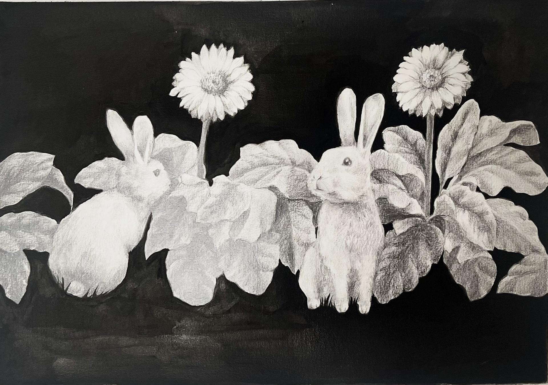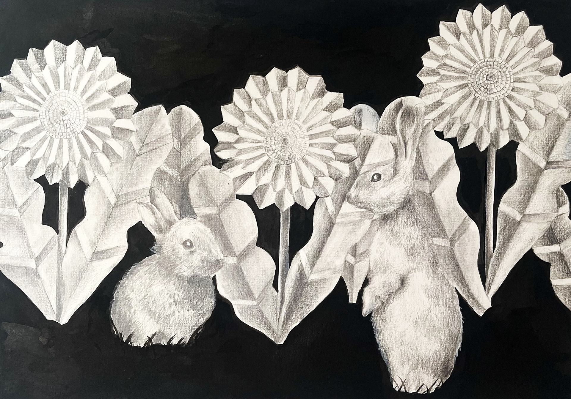 I have been drawn to the rich, profound black created by Japanese ink. Its depth, texture and smell carry a quiet intensity that feels both meditative and expressive. When paired with the delicate contrast of pencil strokes, this combination opens a space to explore the subtleties of the inner world — emotions, memories, and unspoken thoughts.